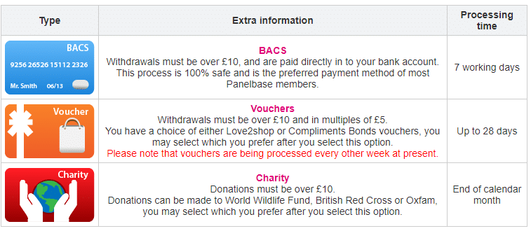 Unlike a lot of other sites PanelBase pays out via BACS, via voucher or you can pay the rewards to charities. There are no points here which is a big plus for me.