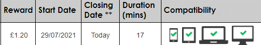The length of the surveys can vary but PanelBase is very open about how long each survey will take and how much you will be paid for completing the survey on the page. The lengths that PanelBase publish are usually accurate as well. Below is an example of what you will see: